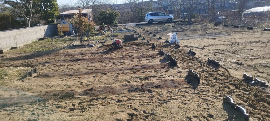 まず、畑の土作り、今日は石灰と鶏糞入れて耕運機で耕します。