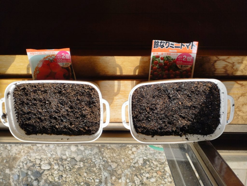 トマトの種をダイソーの土とパックに入れてみる