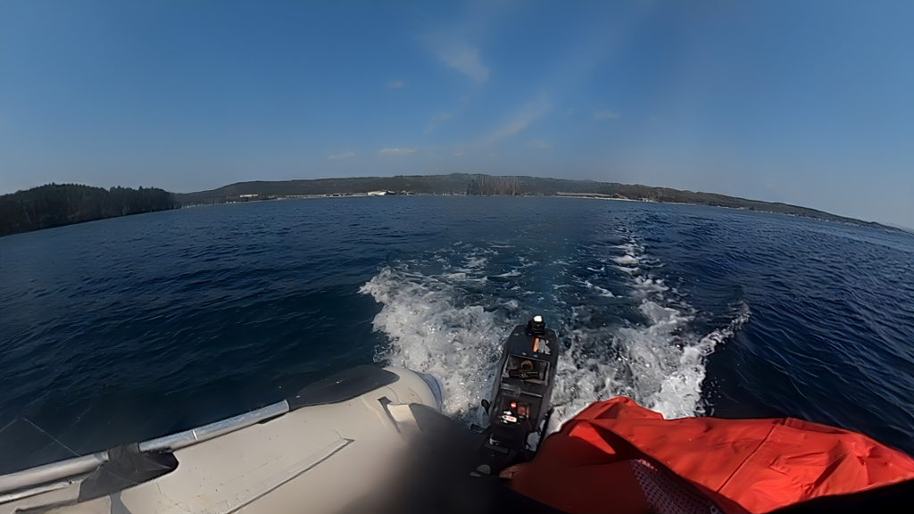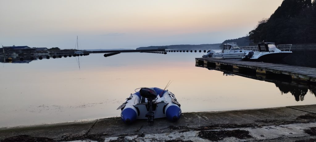 海へゴムボート浮かべエンジンかけようとするもかからない。