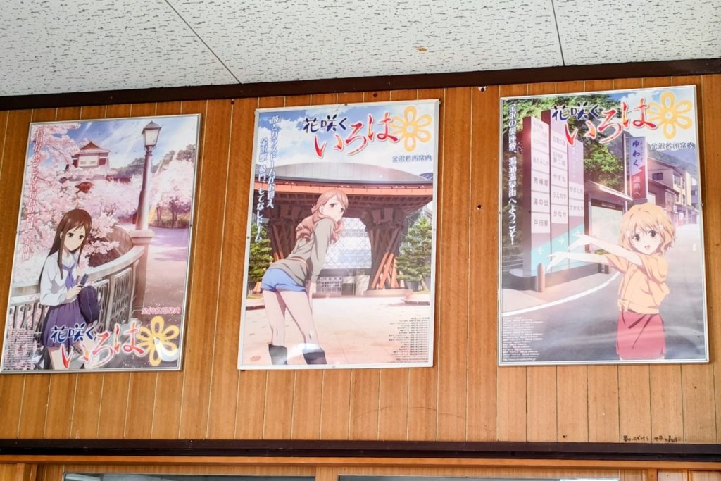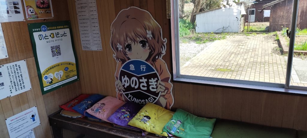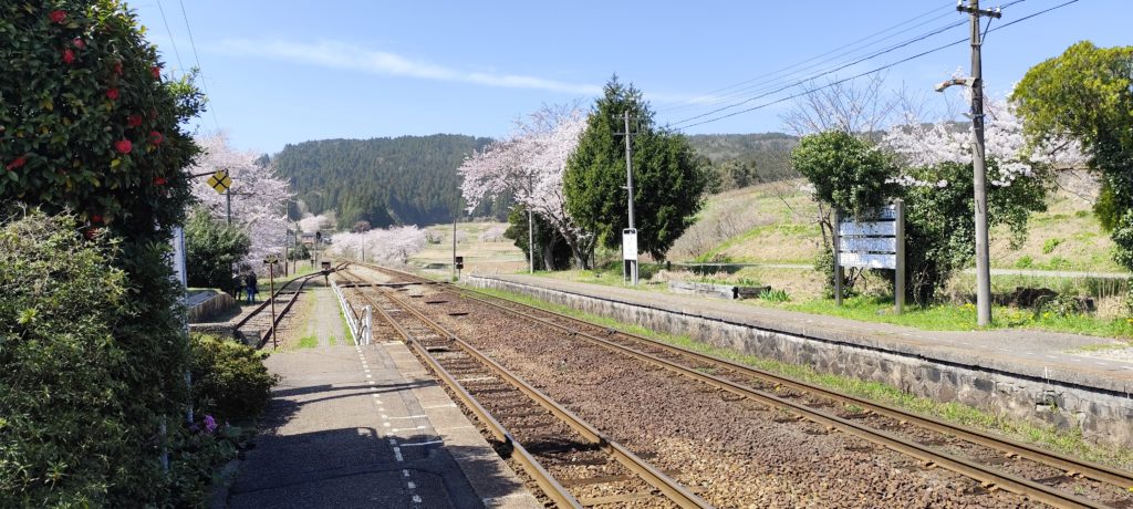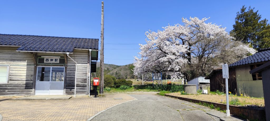 花咲くいろはの元となつてるされる西岸の駅は郵便局や趣のある昔ながらの看板の着いた家も地震で取壊されてしまつたが、丁度桜見ごろ。
